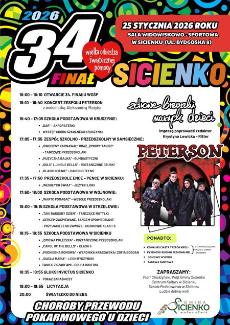 Zespół Peterson to zespół, dla którego muzyka jest największą pasją i sposobem na przekazywanie energii publiczności. Warto dodać, że wokalistką zespołu jest Aleksandra Matyka – mieszkanka Gminy Sicienko. Tym bardziej cieszymy się, że nasi mieszkańcy mogą zobaczyć ją na scenie podczas 34. Finału WOŚP!