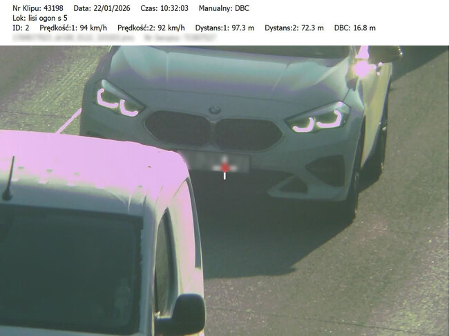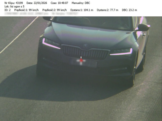 Do przeprowadzonych na drodze ekspresowej S-5 22.01.2026 roku działań, bydgoscy policjanci wykorzystywali urządzenie pomiarowe TruCAM II, wyposażone w funkcję DBC (Distance Between Cars). Ta funkcja umożliwia precyzyjny pomiar odległości pomiędzy pojazdami poruszającymi się drogą ekspresową. Sprzęt ten pozwala na rejestrowanie obrazu oraz przekazywanie materiału dowodowego do patrolu znajdującego się na kolejnym odcinku trasy. Tam policjanci zatrzymują kierowców, którzy nie stosują się do przepisów i pokazują im zarejestrowane wykroczenie na ekranie terminala.