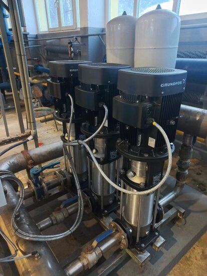 - zakup, wymianę i uruchomienie trzech pomp sieciowych w zestawie hydroforowym, każdej z wbudowanym falownikiem