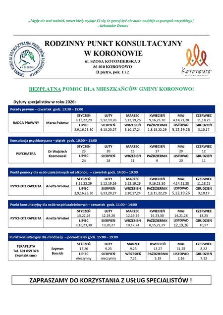 Rejestracja nie jest wymagana. Poniżej grafik specjalistów na rok 2026.
