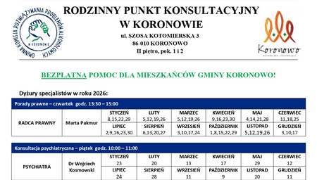 Rodzinny Punkt Konsultacyjny w Koronowie oferuje bezpłatną pomoc dla mieszkańców #Gminy Koronowo w zakresie: porad radcy prawnego, pomocy psychologa, psychoterapeuty oraz psychiatry.