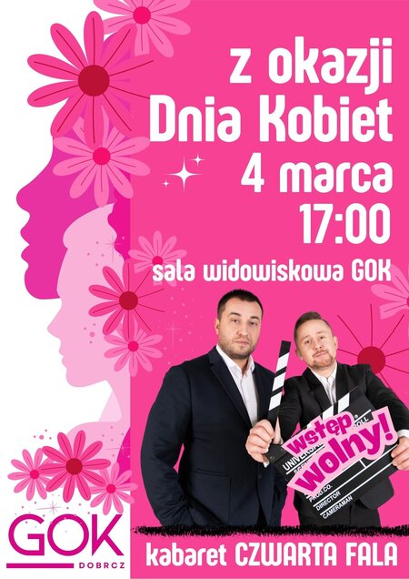 Gminny Ośrodek Kultury Dobrcz serdecznie zaprasza na Kabaret Czwarta Fala z #okazji Dnia Kobiet. Już 4 marca o godzinie 17:00 w sali widowiskowej. Do zobaczenia!