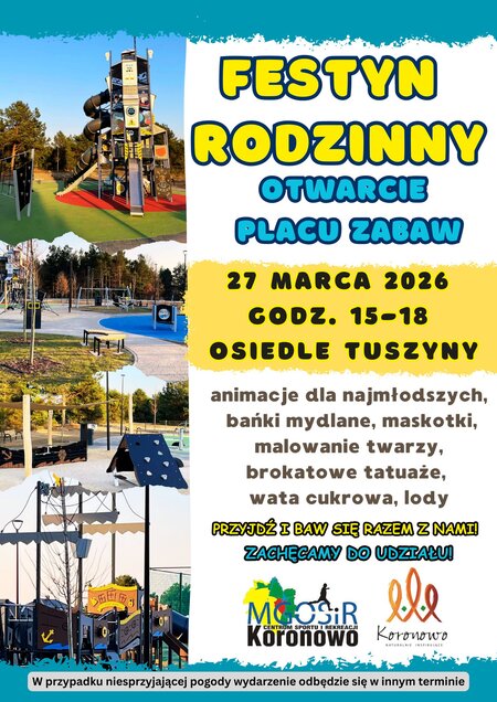 Zapraszamy na Festyn Rodzinny połączony z otwarciem placu zabaw na osiedlu Tuszyny, #który odbędzie się 27 marca 2026 r. w godzinach 15 - 18. Szczegóły na plakacie.