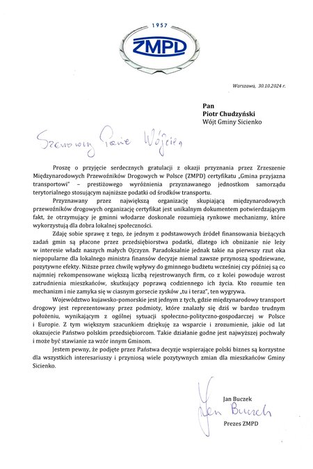 Gmina Sicienko została nagrodzona certyfikatem Zrzeszenia #Międzynarodowych Przewoźników Drogowych „Gmina Przyjazna Transportowi Drogowemu”. Pamiątkowy grawerton odebrał Wójt Gminy Sicienko Piotr Chudzyński z rąk Prezesa Zrzeszenia Jana Buczka podczas VII Sesji Rady Gminy Sicienko.