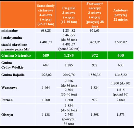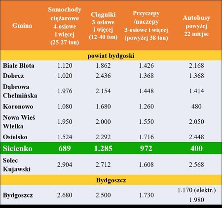 Dla przykładu, w powiecie bydgoskim za duży autobus zapłacimy średnio 1612 zł, w Bydgoszczy 1980 zł, a w gminie Sicienko zaledwie 400 zł. Najmniej, w porównaniu do okolicznych samorządów, w Sicienku zapłacimy też za dużą ciężarówkę, ciągnik i przyczepę (nawet 4 razy taniej).