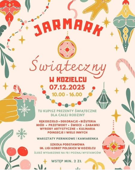 7 grudnia 2025 r. w godz. 10:00-16:00 w Szkoła Podstawowa im. Ligi Kobiet #Polskich w Kozielcu odbędzie się Jarmark Świąteczny. Serdecznie zapraszamy do udziału!