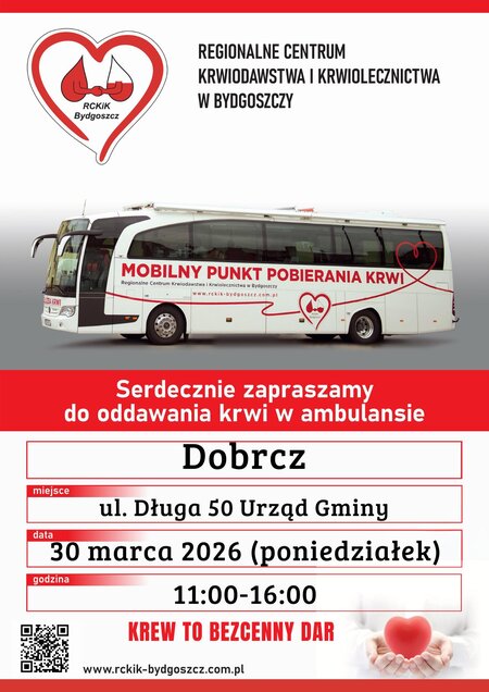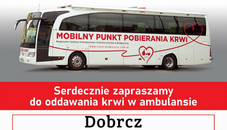 Wójt Gminy Dobrcz Rafał Modlisz serdecznie zaprasza Mieszkańców do włączenia się w akcję #zbiórki krwi, którą przeprowadzi Regionalne Centrum Krwiodawstwa i Krwiolecznictwa Bydgoszcz.