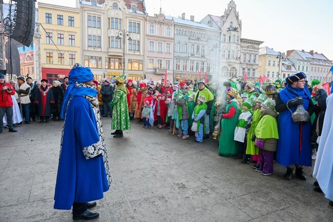 Po zakończeniu liturgii barwny korowód wyruszył w stronę Starego Rynku, by tam, tradycyjnie, oddać pokłon Jezusowi. Przy śpiewie kolęd, animowanych przez chór Diakonii Muzycznej Ruchu Światło-Życie oraz dzieci z Młodzieżowego Domu Kultury nr 2 w Bydgoszczy, Nowonarodzonego przywitali pasterze. Po nich Kacper, Melchior i Baltazar złożyli dary, oddając cześć Dzieciątku.