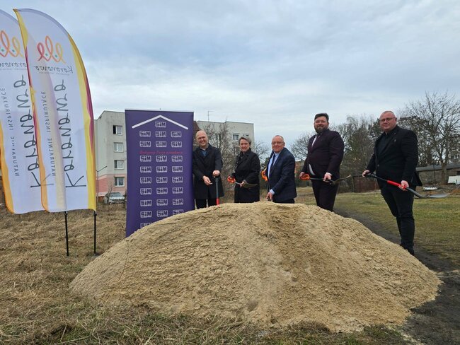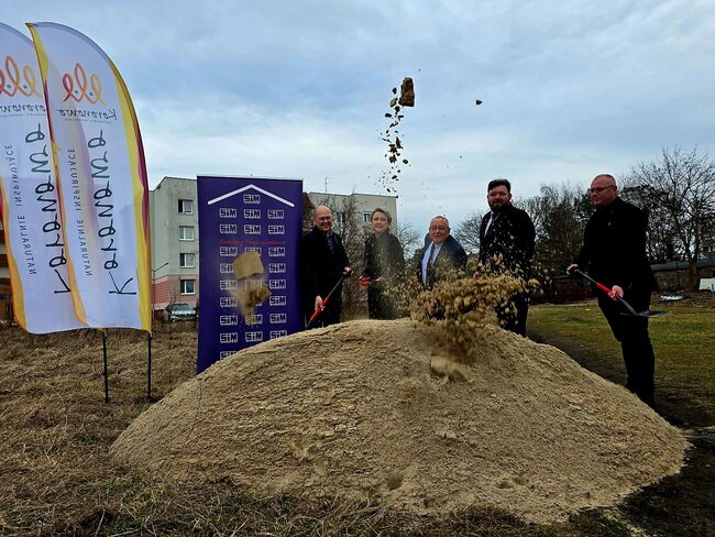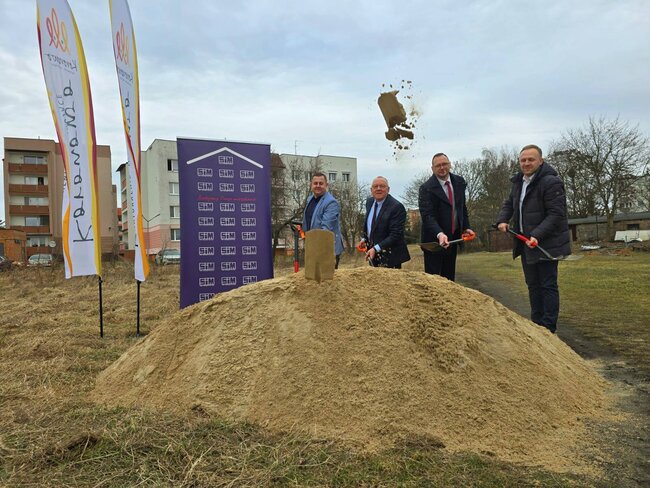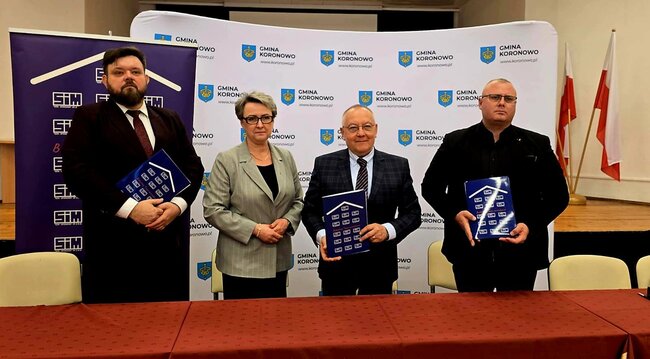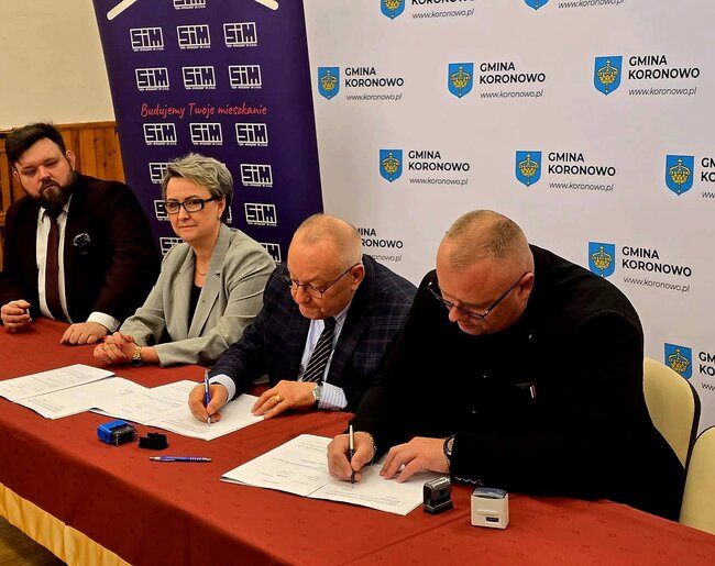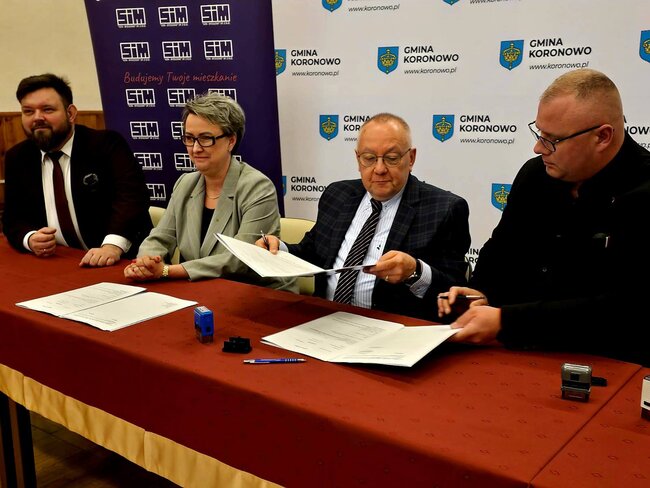 W dniu 20.03.2026 r. w murach Ratusza Urzędu Miejskiego w Koronowie odbyło się uroczyste podpisanie umowy z Generalnym Wykonawcą inwestycji mieszkaniowej – firmą CERTA Trzemeszno Sp. z o. o. Symboliczne wbicie łopaty oficjalnie rozpoczęło prace budowlane.