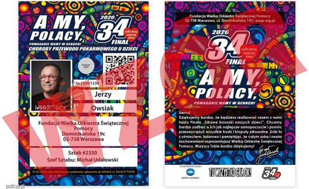 - Dodatkowo identyfikator musi mieć „serduszkowe” logo Fundacji Wielkiej Orkiestry Świątecznej Pomocy;