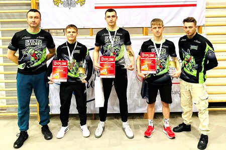 - Andrzej Górecki i Kacper Draus w kat. wag. 57 wywalczyli brązowe medale. Los chciał że chłopacy stanęli na przeciw siebie już w drugiej rundzie eliminacyjnej (Andrzej pewnie zwyciężył). W końcowym rozrachunku ten pojedynek „rozstawił” ich w walkach o 3 miejsca, i nasz najlżejszy duet po ciężkich pojedynkach mógł się cieszyć ze zwycięstw. (Na uwagę zasługuję fakt, że dla Andrzeja to 6 medal /1 złoty, 2 srebrne, 3 brązowe/, a dla Kacpra to 3 medal /1 srebrny, 2 brązowe/ Mistrzostw Polski).